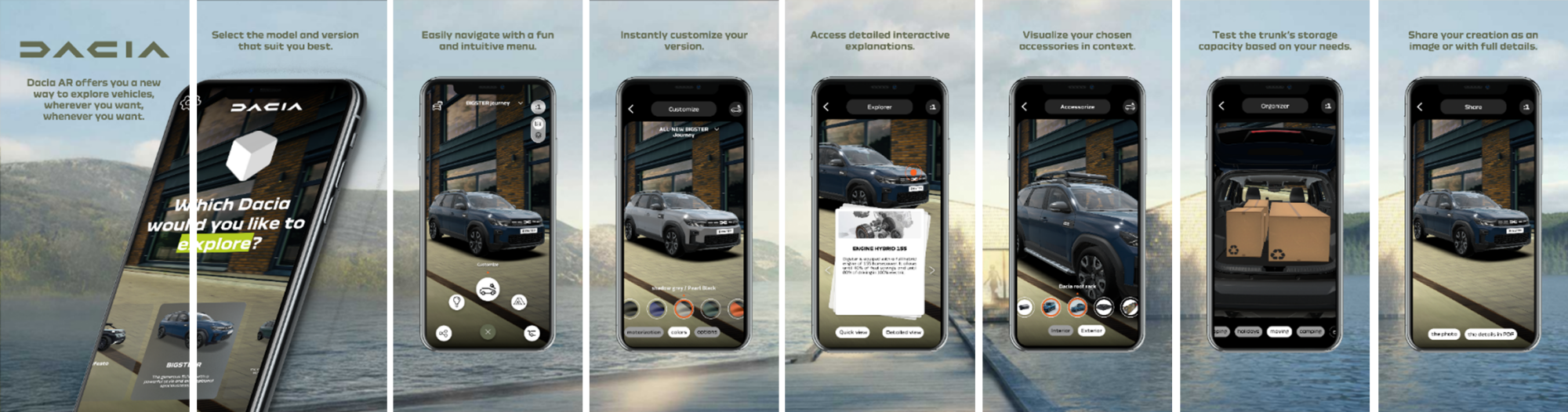 Pateicoties šaiinovatīvajai lietotnei, lietotāji var vizualizēt Dacia automobiļus reālāmērogā gan no ārpuses, gan no iekšpuses. Ir iespējams izvēlēties krāsu,pielāgot modeli ar piederumiem un izpētīt katru detaļu ar augstu reālismalīmeni, un tas viss jūsu iecienītākajā ierīcē.