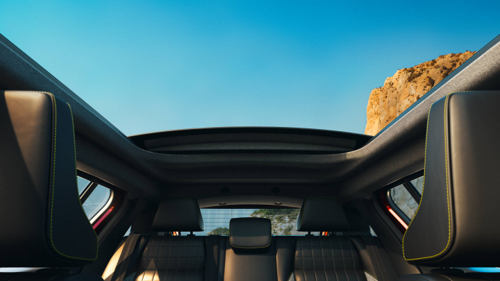 Melnais audekla jumts ir pārsteidzoša dizaina iezīme, kas piešķir Renault4 E-Tech electric jaunu izskatu. Jumta stieņi ir noņemti, lai maksimālipalielinātu atvērumu, bet antena tagad ir integrēta aizmugurējā logā. Jau nopaša sākuma transportlīdzeklis tika projektēts ar šādu jumtu, tāpēc tas būtiskineietekmē nevienu no tā galvenajām īpašībām. Piemēram, telpa galvai paliekpraktiski nemainīga: 906 mm priekšpusē un 813 mm aizmugurē salīdzinājumā ar 886mm un 853 mm versijā ar parasto jumtu.